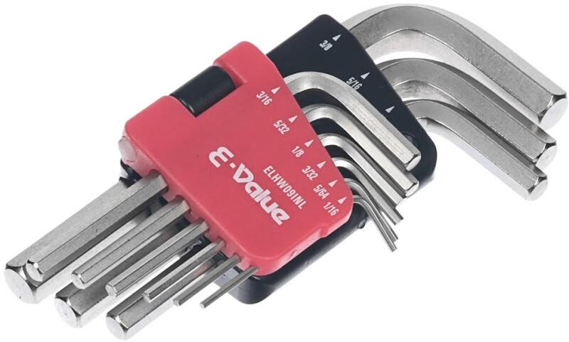 Az E-VALUE 9 darabos imbuszkulcs készletet tartósságra és sokoldalúságra terveztek. Ez a készlet nikkelezett a rozsdásodás elkerülése érdekében, biztosítva a hosszú távú használatot. Ideális imbuszcsavarok meghúzásához és lazításához. A készlet az alábbi méreteket tartalmazza: 1/16, 5/64, 3/32, 1/8, 5/32, 3/16, 1/4, 5/16, és 3/8 hüvelyk. A készlet mérete 64 x 121 x 27 mm, súlya pedig 248 g, így kompakt és könnyen hordozható. Tartalmaz egy kényelmes, szétnyitható tartót, amely megkönnyíti a hordozást, tárolást és a kulcsok elérését.