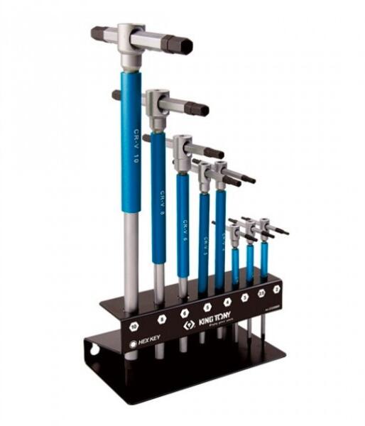 King Tony 23208MR 8 db-os imbuszkulcs készlet fém állvánnyal. Metrikus imbuszkulcs méretek :H2, H2.5, H3, H4, H5, H6, H8, H10.